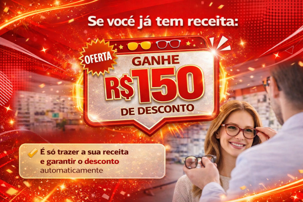 Com avaliação profissional para você enxergar melhor e escolher o óculos ideal com segurança. Fazendo o exame de vista conosco você ganha R$50 de desconto no seu óculos.